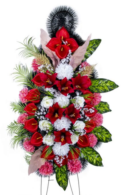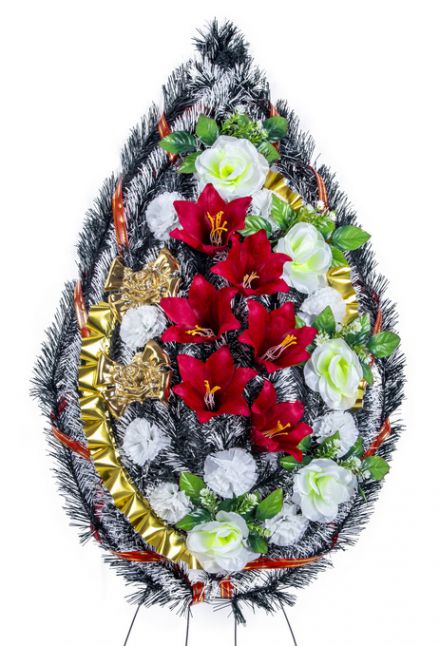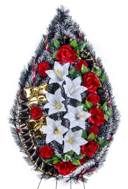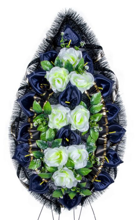 Цей ритуальний вінок має класичну овальну форму, що надає йому традиційного та урочистого вигляду, гідного для церемоній прощання. Його композиція є яскравою, але водночас стриманою, символізуючи любов, чистоту та вічний спокій.