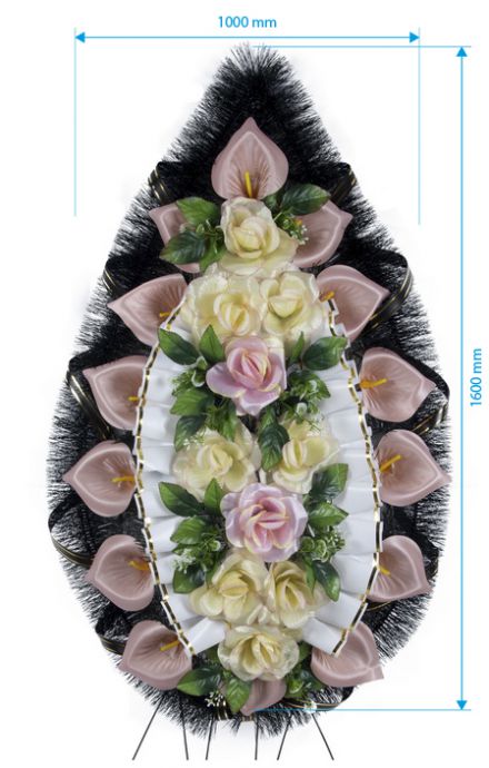 Цей ритуальний вінок має класичну овальну форму, яка надає йому витонченого та спокійного вигляду, і є гідним символом пам'яті та прощання.