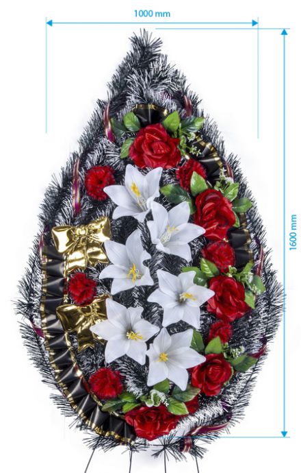 Цей ритуальний вінок має класичну овальну форму, що надає йому традиційного та урочистого вигляду, гідного для церемоній прощання. Його композиція є яскравою, але водночас стриманою, символізуючи любов, чистоту та вічний спокій.