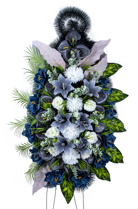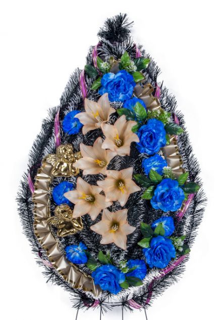Цей ритуальний вінок має класичну овальну, витягнуту форму, що символізує нескінченність пам'яті та спокій. Його композиція вирізняється вишуканим поєднанням кольорів та декоративних елементів, створюючи урочистий та зворушливий вигляд.