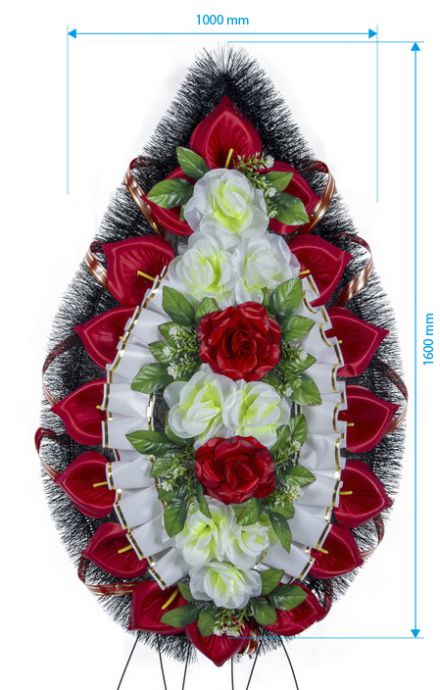 Загальний вигляд: Вінок має дуже виразну та чітко структуровану композицію. Поєднання яскравих червоних квітів з ніжними білими та зеленуватими відтінками, а також елегантними стрічками, створює відчуття глибокої поваги та пам'яті. Це гідний та вишуканий символ прощання.