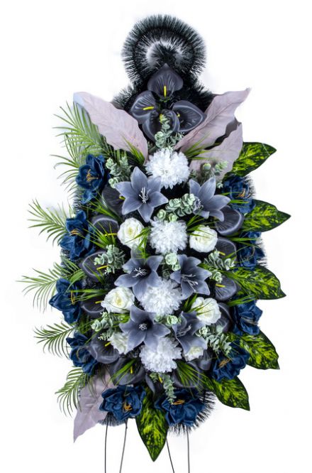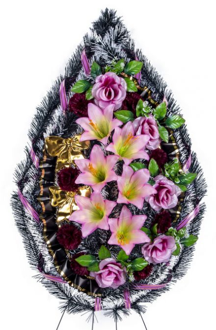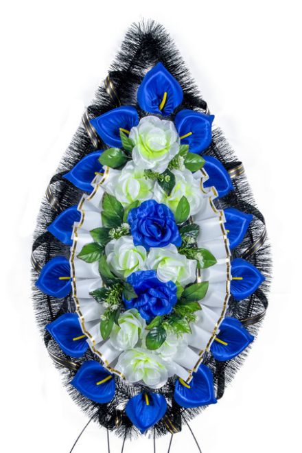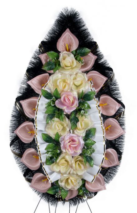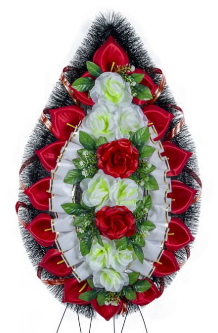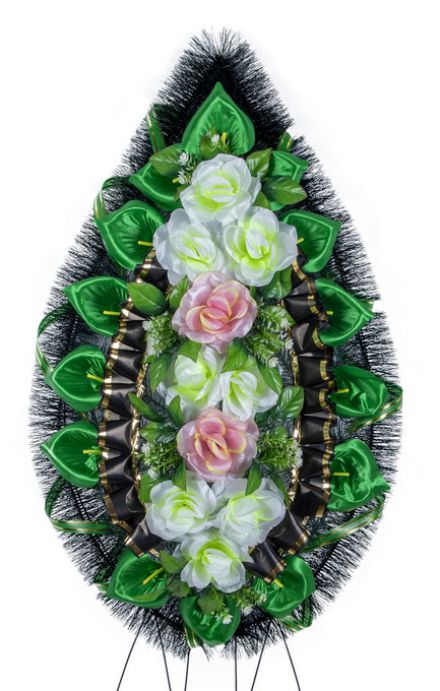 Цей ритуальний вінок має класичну овальну форму, що надає йому традиційного та урочистого вигляду, гідного для церемоній прощання. Його композиція є яскравою, але водночас стриманою, символізуючи любов, чистоту та вічний спокій.
