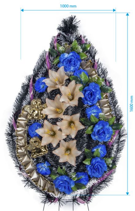 Цей ритуальний вінок має класичну овальну, витягнуту форму, що символізує нескінченність пам'яті та спокій. Його композиція вирізняється вишуканим поєднанням кольорів та декоративних елементів, створюючи урочистий та зворушливий вигляд.